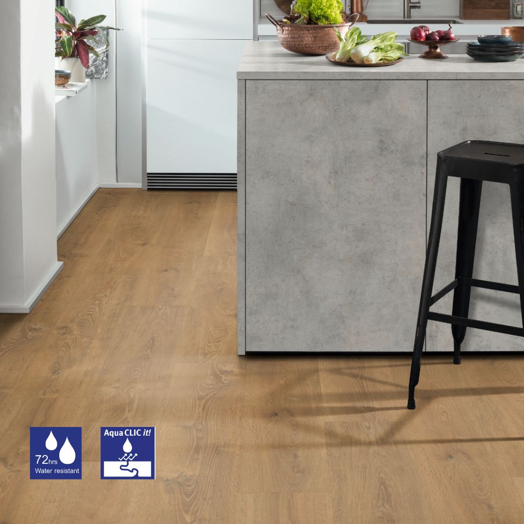 - Dvostruka zaštita od vlage koju pružaju nosiva ploča Aqua+ i vodonepropusni uklopni sustav Aqua CLIC it! ovom podu daje otpornost na vlagu tijekom 72 sata.